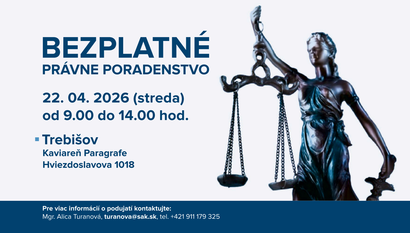Slovenská advokátska komora pripravuje aj tento rok celoslovenský projekt bezplatného právneho poradenstva. Tímy skúsených advokátok a advokátov budú k dispozícii všetkým záujemcom o právnu pomoc 22. apríla 2026 od 9.00 hod. do 14.00 hod. v rekordnom počte až 24 miest po celom Slovensku.