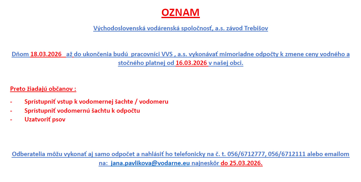 Oznam VVS, a.s. - vykonanie mimoriadnych odpočtov pre zmenu ceny vodného a stočného